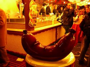 | ニュルンベルク・ソーセージの屋台(左手) | メインストリートに掲げられたクリストキントの人形 (中央奥)。 右手は子ども向けのクリスマス市の会場 |